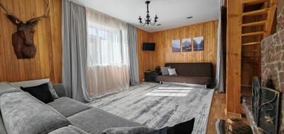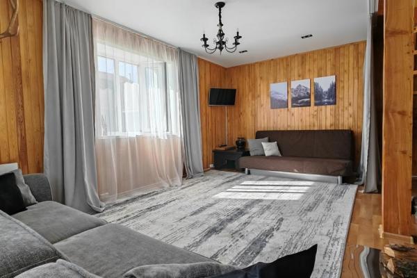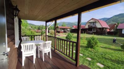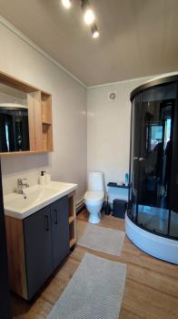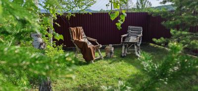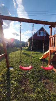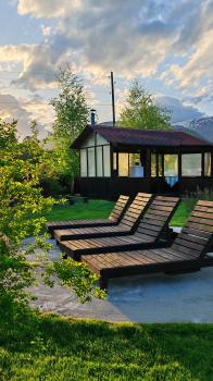 Дом продуман до мелочей! В доме оборудованная просторная кухня (холодильник, микроволновая печь, газ.плита, необходимый набор посуды), большой санузел с душем. В спальной комнате комфортная двуспальная кровать (2 осн. места) и раскладывающийся диван (2 доп. места), телевизор. . Уютная терраса с обеденной зоной, подвесными креслами и отличным видом на горы и территорию — это лучшее место для отдыха и расслабления! Рядом с домом находится беседка с оборудованной кухней и мангал.