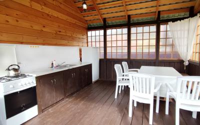 Пространство в гоством доме организовано так, чтобы у Вас было ощущение своего собственного домика в горах. Поэтому во всех домах класса Комфорт и на всех трех беседках оборудованы полноценные кухни с необходимым набором посуды и бытовой техники: