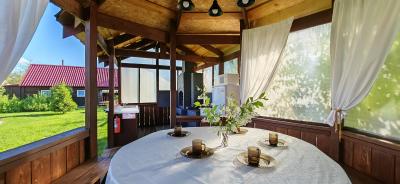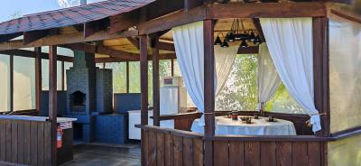 3 беседки с оборудованными кухонными зонами: газовая плита, холодильник, микроволновая печь, чайник, раковина с холодной водой и необходимый набор посуды. Около всех беседок есть мангалы. В одной из беседок есть печь для барбекю и казана.