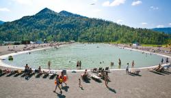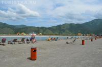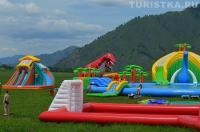 Детская развлекательная территория находится рядом с озером. Это надувные батуты, горки, бассейны. Есть бассейн для самых маленьких с глубиной 20 см, есть бассейн глубиной 40 см. По всей территории расположились лежаки для отдыха взрослых. Дежурят спасатели.