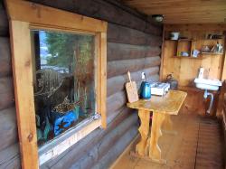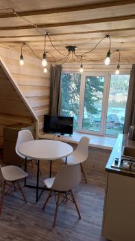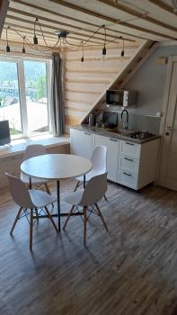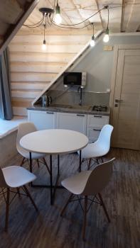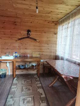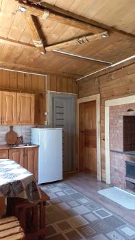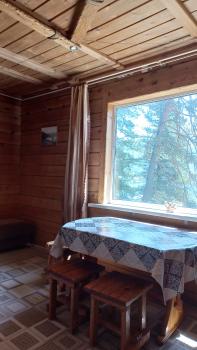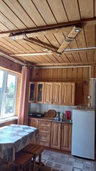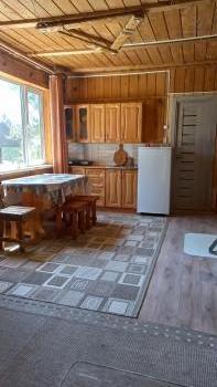 - На первом этаже дома есть кухня с кедровой мебелью, раковина с холодной водой, электрочайник, электроплита, посуда.