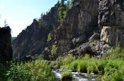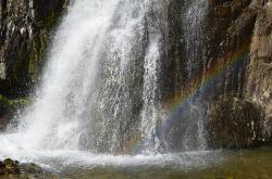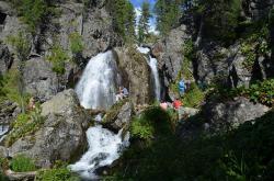 Водопад притягивает взгляд, в его брызгах при солнечной погоде играет радуга. Камни вокруг поросли баданом, смородиной. Отвесные скалы обступили ущелье. Картина очень живописная! Можно искупаться под струями текущей воды, можно пройти на другой берег по бревну, полазить по скалам, можно спуститься вниз по течению Муехты и посмотреть на ущелье после водопада.