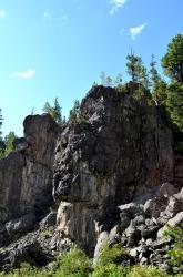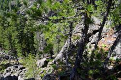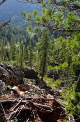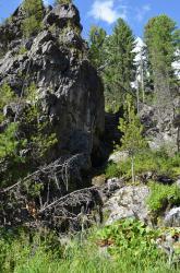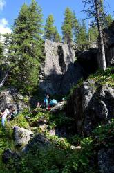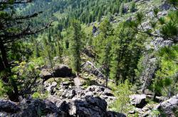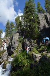 После смотровой площадки на последних метрах к водопаду спуск очень крутой. Приходится цепляться за корни кедров и лиственниц. После дождя, наверное, сложно здесь спуститься-подняться. Но вот вертикальный спуск закончился, и вы у водопада!