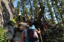 Экскурсию до Муехтинского водопада предлагают на базе Каракольские озера. Путь начинается от четвертого озера к перевалу Багаташ, дальше до Замка Горных духов и потом, налево и вниз на юго-восток. После спуска от Замков горных духов, будет проход по плоскогорью. Справа откроется прекрасный вид на горы. Тропа должна привести к деревянным конструкциям для натягивания шкур. В этом месте будет ответвление тропы вправо, она пойдет в лес. Сначала лес редкий, вокруг много черники, жимолости. Скоро начнется спуск. По ходу, справа и слева от тропы будет много упавших сухих деревьев, у подножья кедров и елей ковер бадана и карликовой березы. На спуске, слева от тропы будет площадка, с которой видно ущелье, правда водопад прячется в зелени.