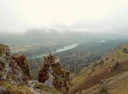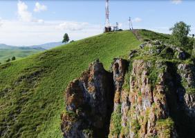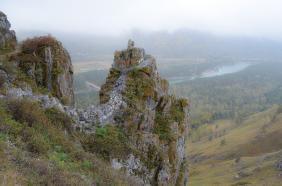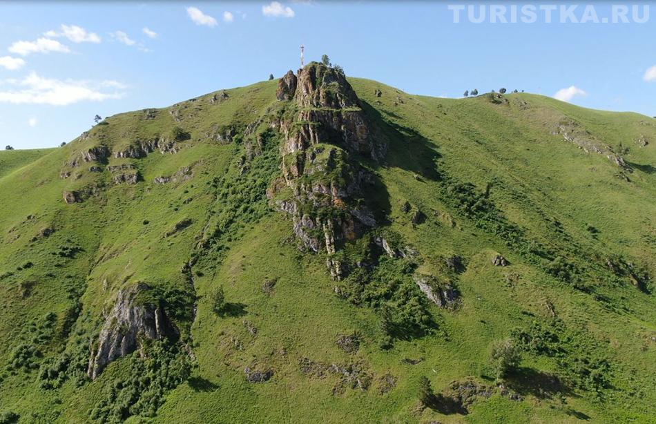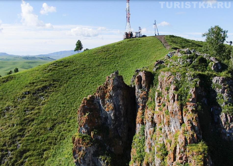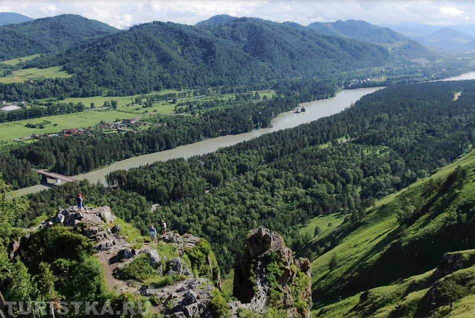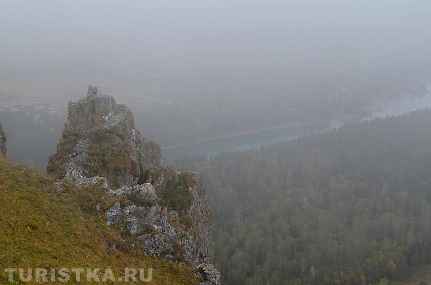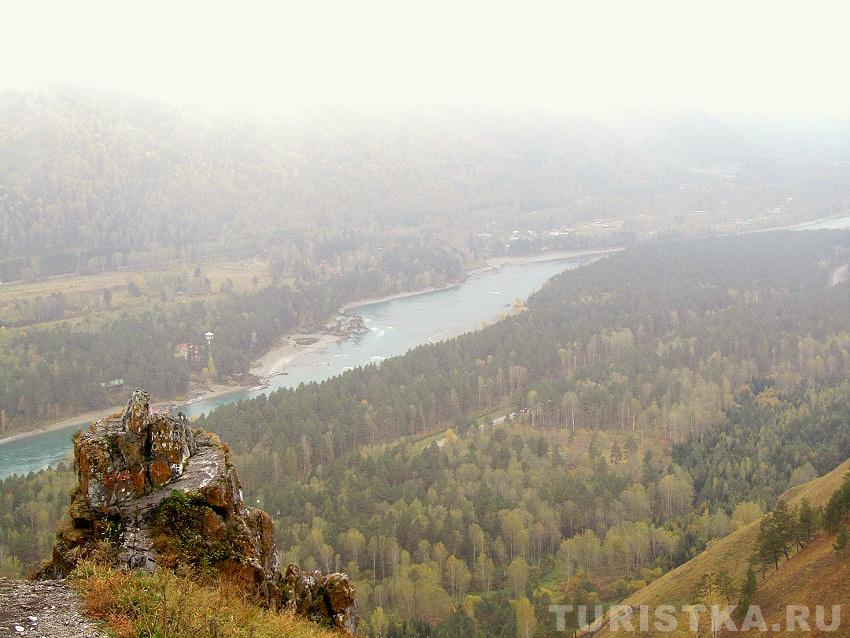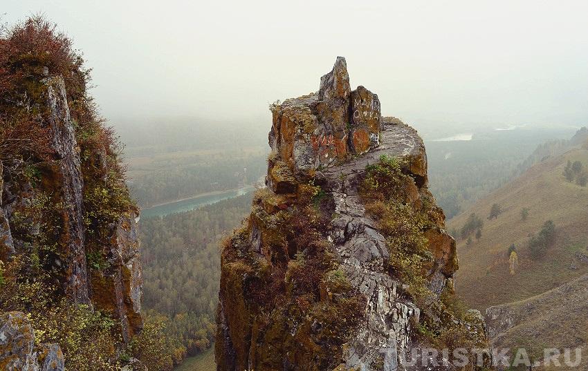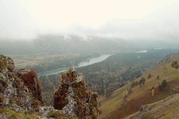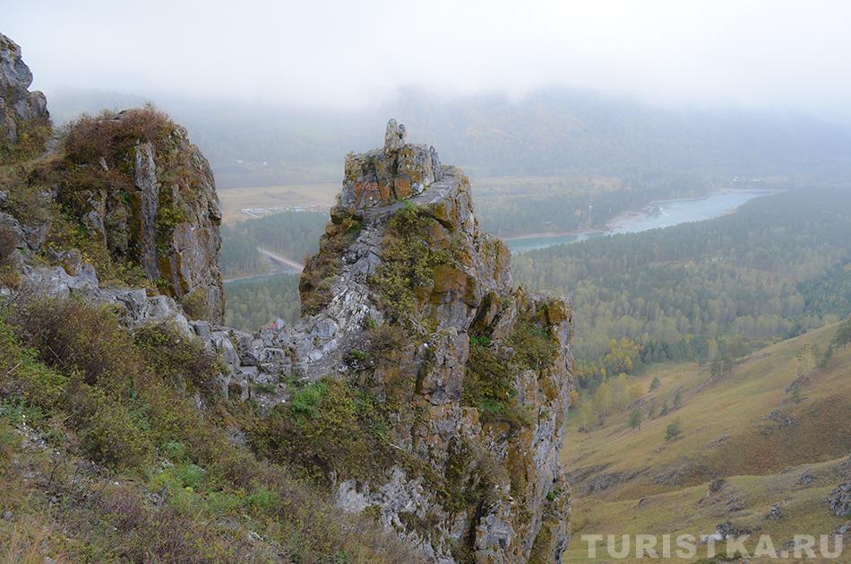 Сориентироваться поможет вышка оператора сотовой связи — чуть левее находится и сам Чертов палец. С вершины горы открывается изумительный вид на долину реки Катунь и незабываемая панорама Алтайских гор. Здесь получаются очень красивые фотографии, а также есть удобная площадка, где можно просто сидеть и любоваться пейзажем. Если погода пасмурная, не отступайтесь от задуманного путешествия — в туманной дымке горы приобретают особое очарование.