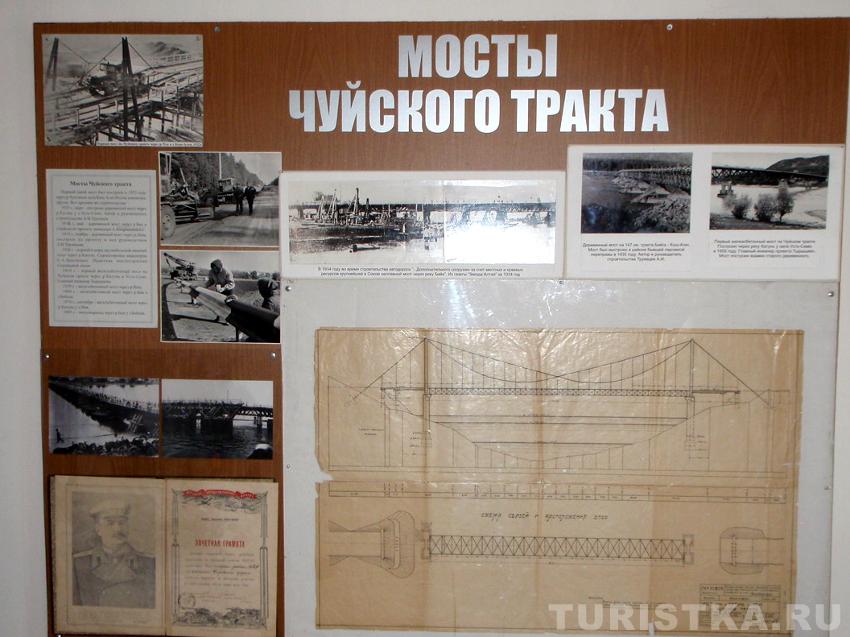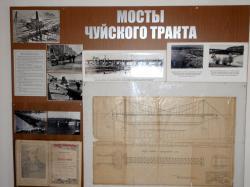 Интереснейшей экспозицией краеведческого музея является «История Чуйского тракта», где можно увидеть рельефную карту местности, первые географические карты, петроглифы, колеса от повозок китайского и монгольского происхождения, модели первых автомобилей, чертежи дороги и нивелир В. Я. Шишкова, картины бийских художников. В музее также достаточно материалов о людях, чья жизнь так или иначе соприкасалась с Чуйским трактом: Обручев, Потанин, Рерих, Шукшин, Евдокимов.