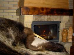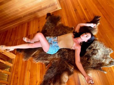 - комната с камином - диван (2 спальных места), ТВ, камин, кресло из ротанга, шкура медведя;
