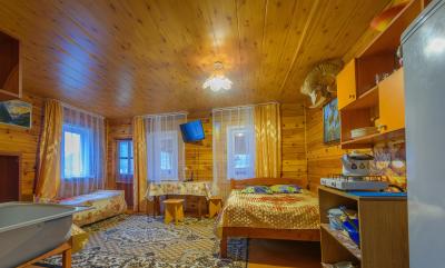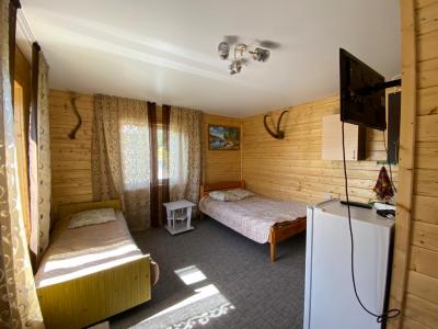 - 4-хместный номер на 1-ом этаже — 5000 руб./сутки. Санузел (туалет, душ) в номере, 2 двуспальные кровати, место для приготовления еды, телевизор, холодильник, посуда.