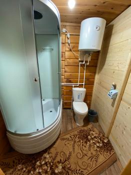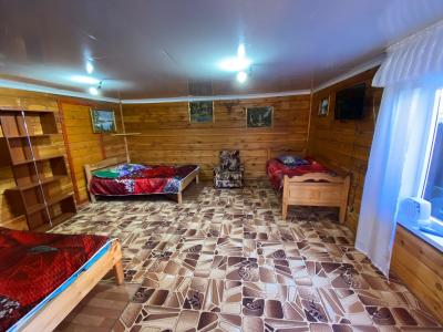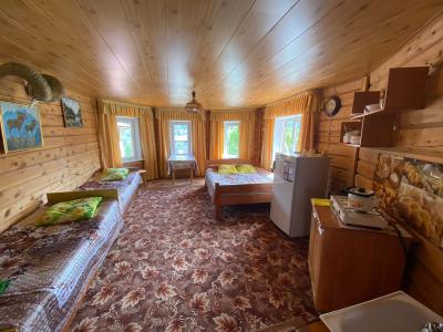 - 4-хместный номер на 2-ом этаже — 5000 руб./сутки. Санузел (туалет, душ) на этаже, 1 двуспальная кровать, 2 односпальных кровати, холодильник, телевизор, место для приготовления еды, посуда. Душевая комната и туалет на этаже.