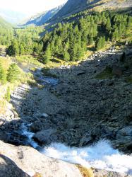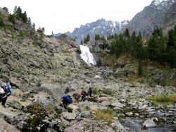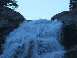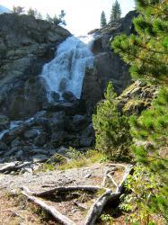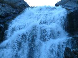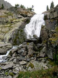 Спускаясь с перевала и любуясь спокойными Куйгукскими озерами, которые находятся выше водопада, даже не подумаешь, что спокойствие воды разом заканчивается у обрыва. Падая и подскакивая по камням, вода с грохотом летит вниз около 30 метров!