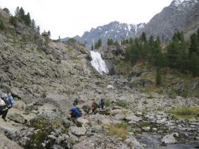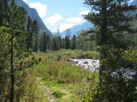 От устья реки тропа идет по живописной Куйгукской долине. Вдоль тропы растет много брусники, черники и жимолости. Чередуя спуски и подъемы, дорога все же идет вверх, набор высоты увеличивается, и, наконец, ущелье перегораживает скальная плита. С самого верха с грохотом падает Куйгукский водопад. Подходить к водопаду лучше по правой стороне реки. Поднимаемся выше в крутую скальную гору. И вот отсюда со спины открывается вид на долину реки Куйгук, а прямо перед вами будут Куйгукские озера.