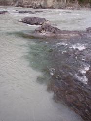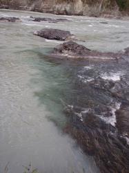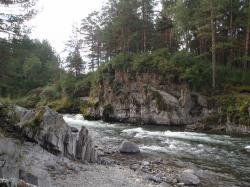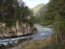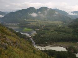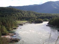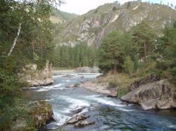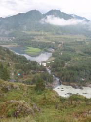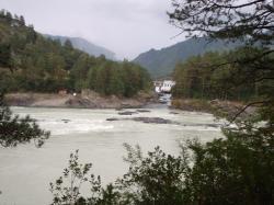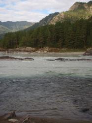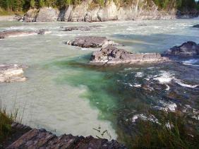 Примерно через 50 метров после того, как река Чемал прыгнула с плотины ГЭС, она впадает в Катунь. Пройдите немного вниз от ГЭС и вы увидите, как темно-зеленые воды Чемала вливаются в матово-серый поток Катуни. На границе двух потоков образуются очень красивые узоры.
