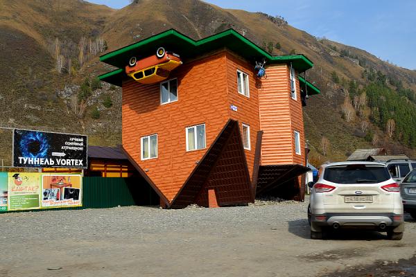 Находится Перевертыш в центре села Манжерок, вы обязательно его увидите слева от дороги, если ехать дальше на Алтай. Дом привлекает внимание, потому что он стоит на крыше! И касса у него тоже перевернутая!