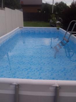 - Каркасный бассейн 4×2×1.22 с прозрачной водой, шезлонги, детская площадка