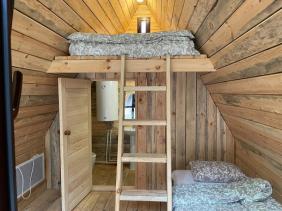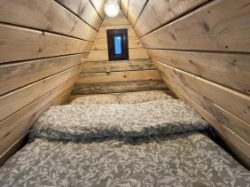 | 3-х местные благоустроенные домики с панорамным окном в лес, а-фрейм. (Д8, Д9, Д10, Д11, Д12, Д13, Д14, Д15, Д16, Д17) Душ, унитаз, раковина, электрочайник, одна кровать двухместная на втором ярусе, одна кровать одноместная на полу, обогреватель, постельное белье. На веранде стол и табуретки. Экологичные домики полностью из натурального необработанного дерева в стиле советских палаток по индивидуальному проекту Зелёного колобка, таких домиков больше нигде нет.;) |