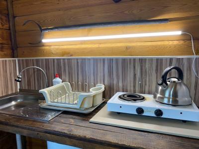 - Кухня (холодильник, 2х конфорочная плита, чайник, посуда)