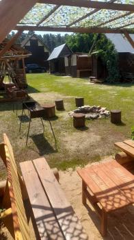 - деревянный столик и лавочки возле домика