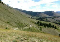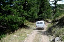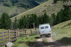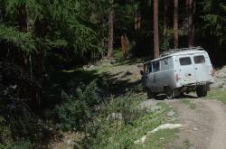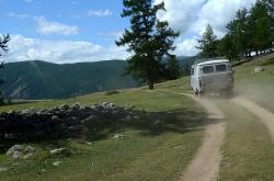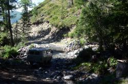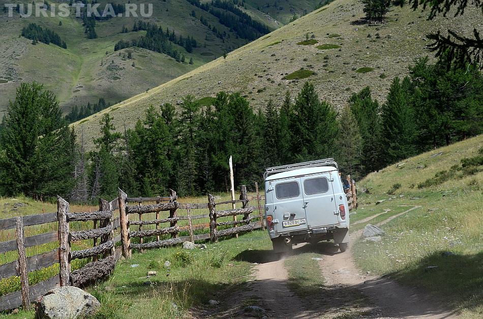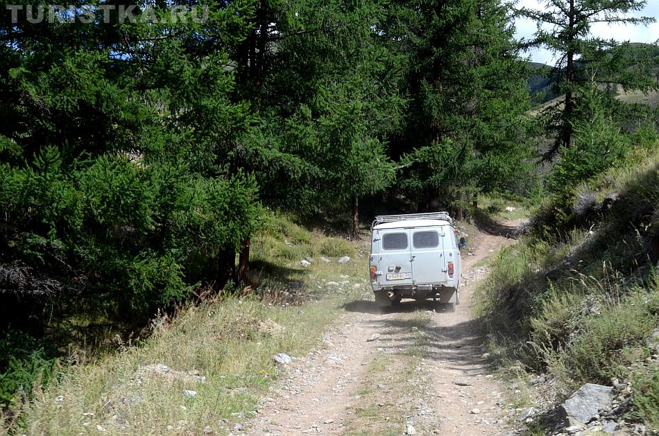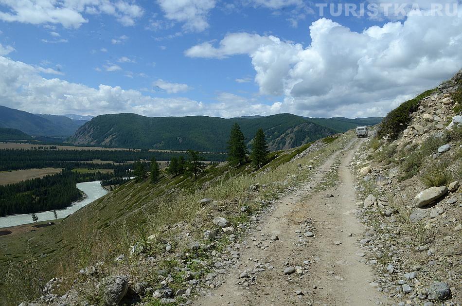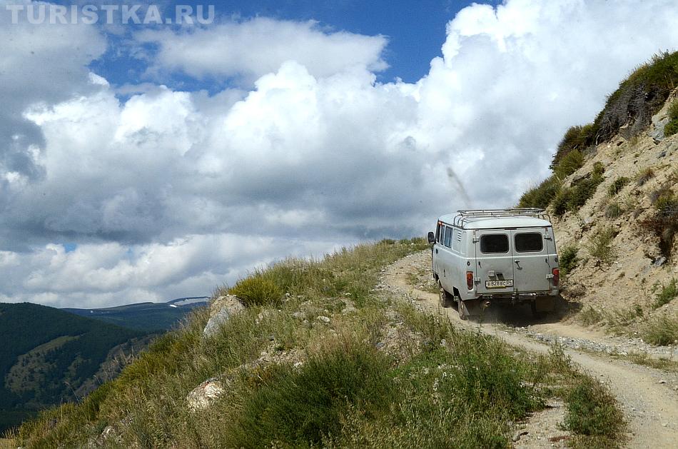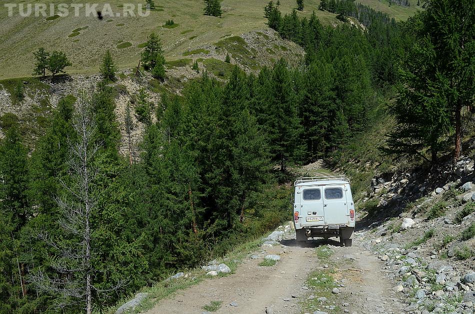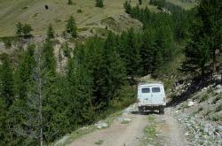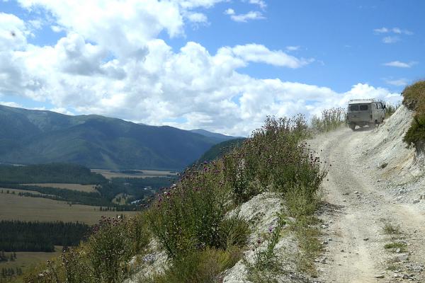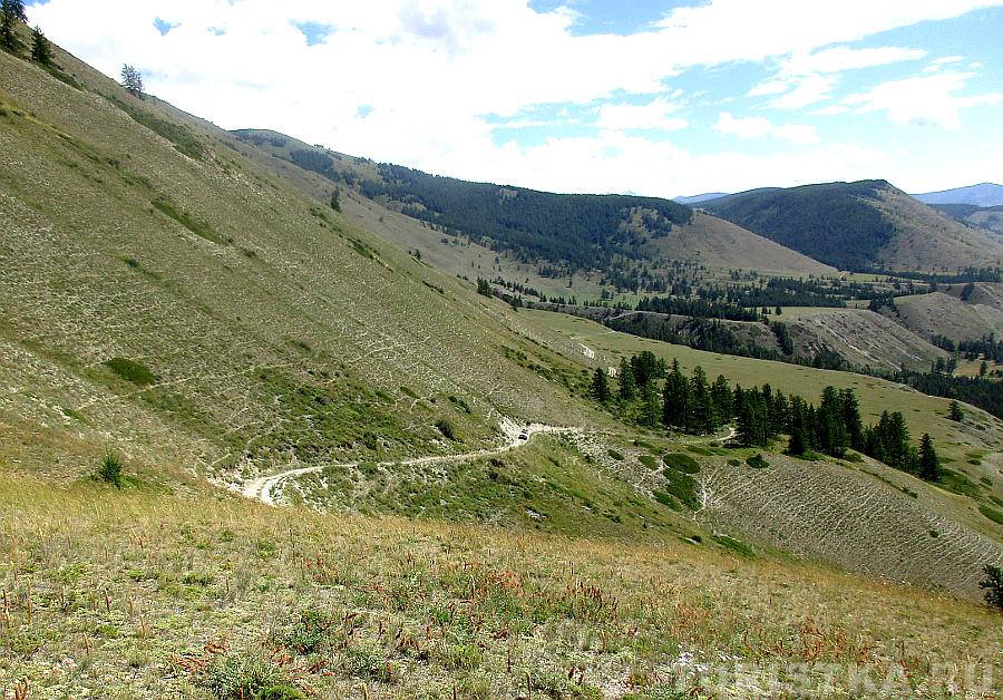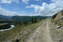 После долины начинается затяжной подъем. Дорога вырублена в крутом склоне правого берега Аргута. Подъем проходится машинами на пониженной передаче. Добираться до перевала Верблюжья шея надо на внедорожнике, а лучше нанять УАЗик в Джазаторе.