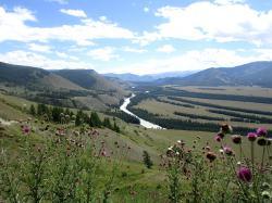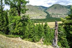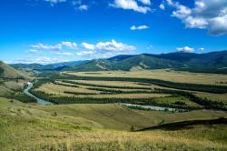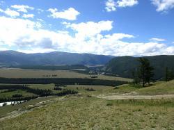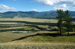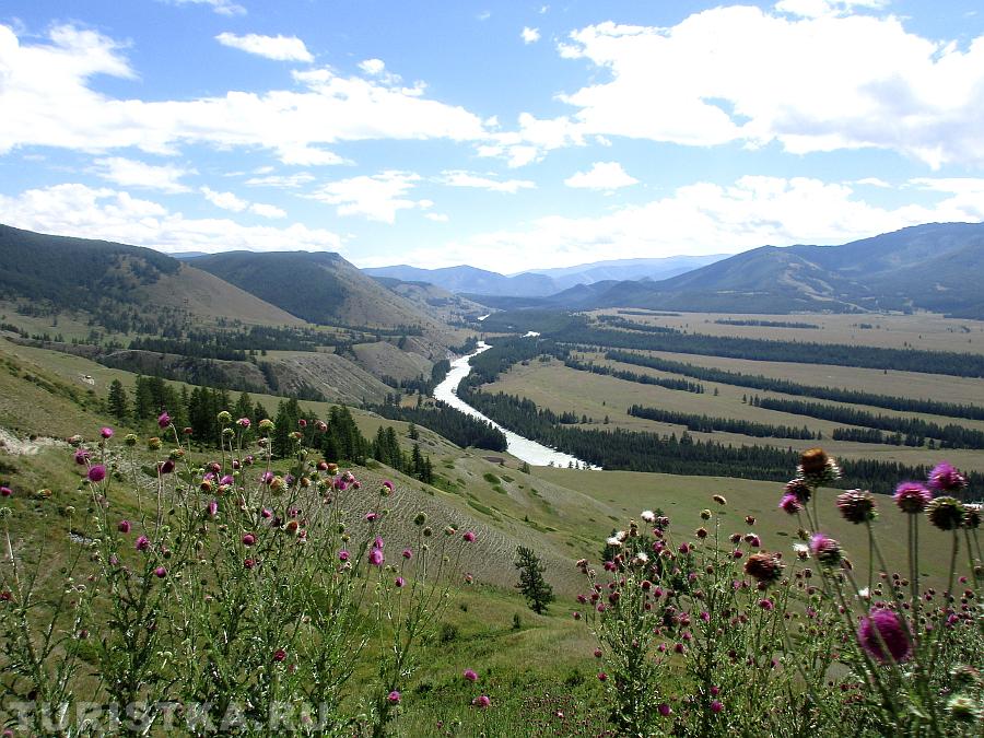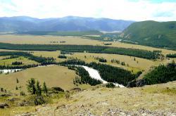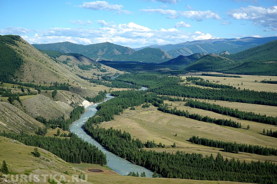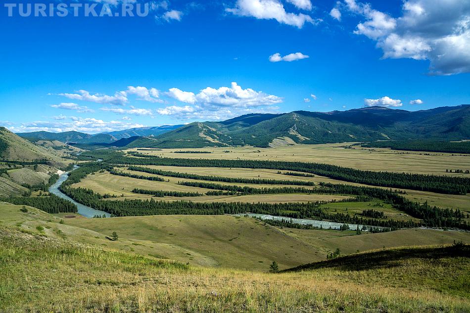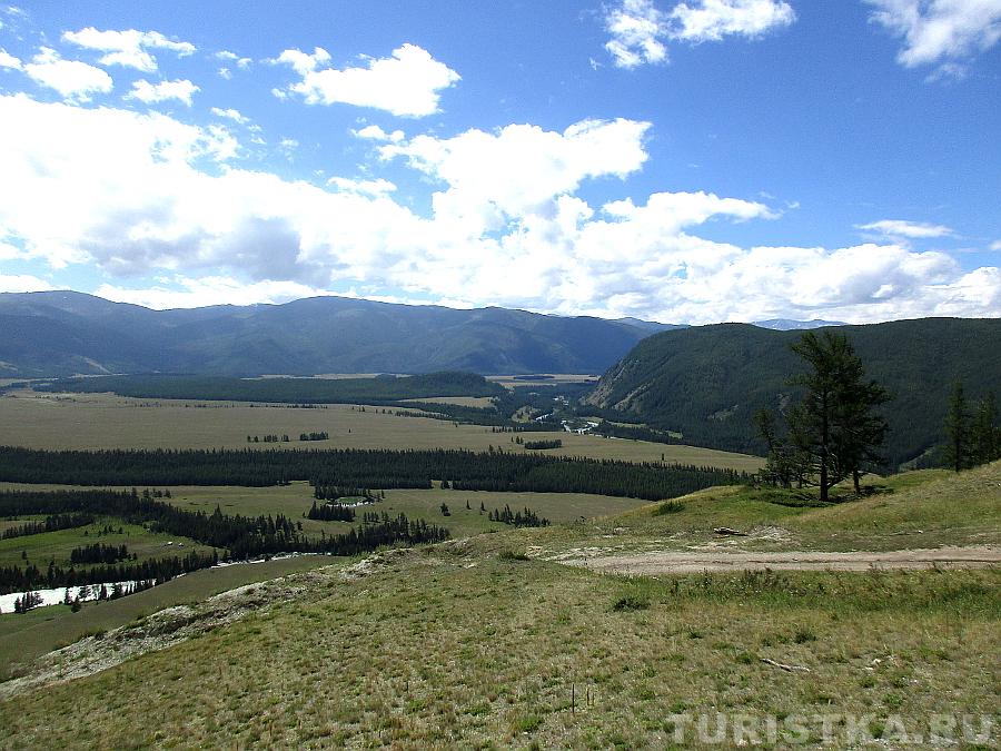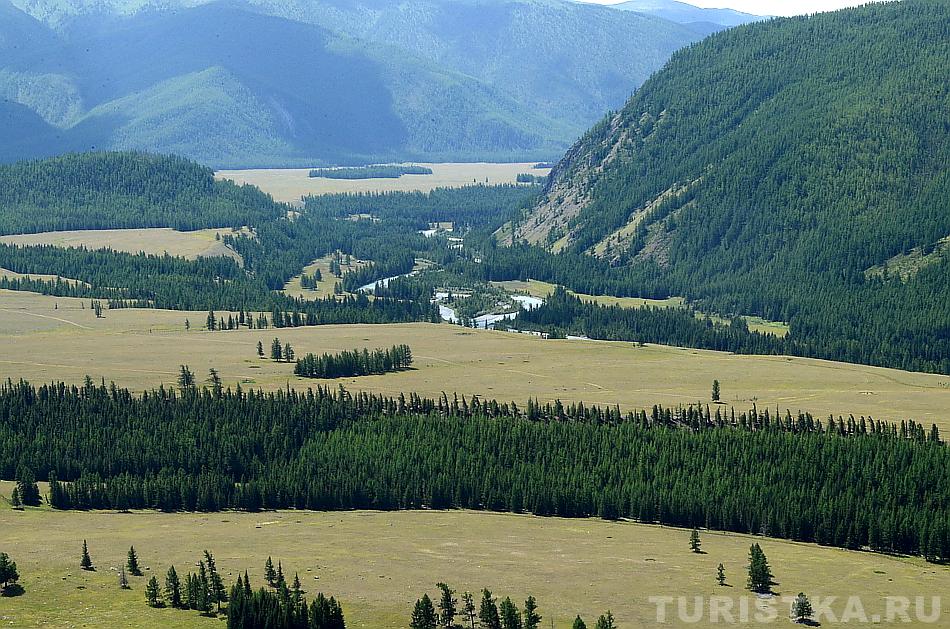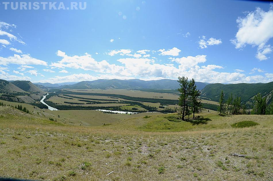 Вид с перевала впечатляющий: открывается простор степи Самаха, которую слева и снизу ограничивает река Аргут, а справа река Коксу.