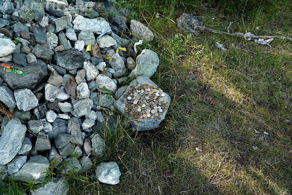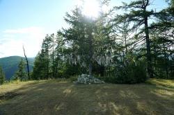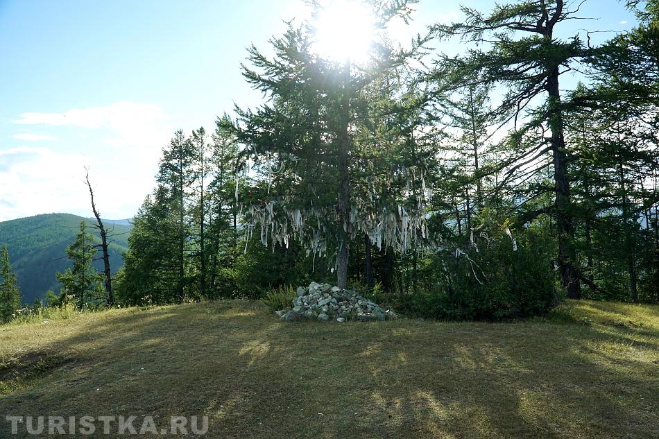 На перевале стоит Обо, куда складывают приношения духам, рядом лиственница, увешанная ленточками.