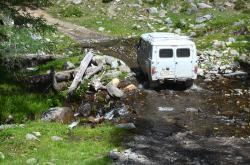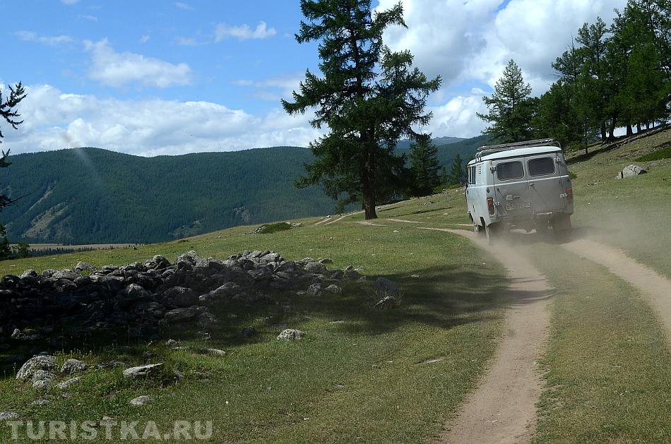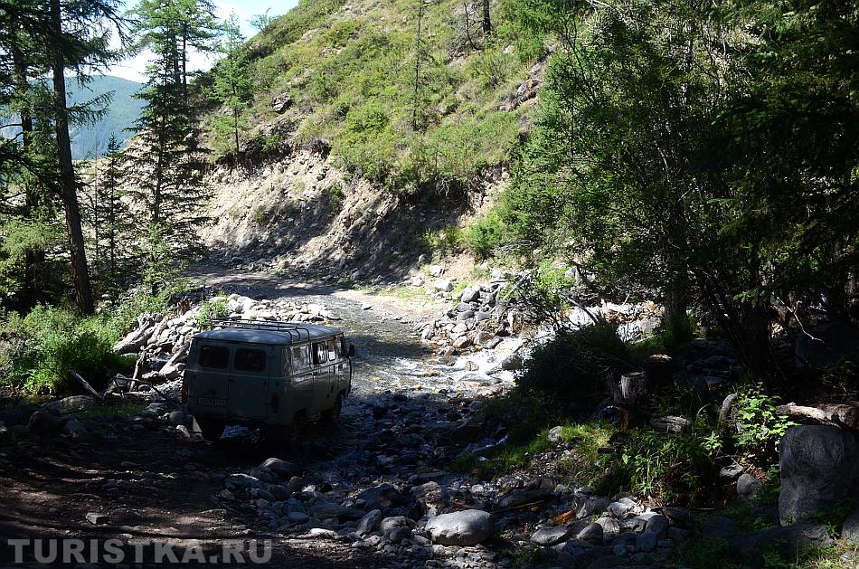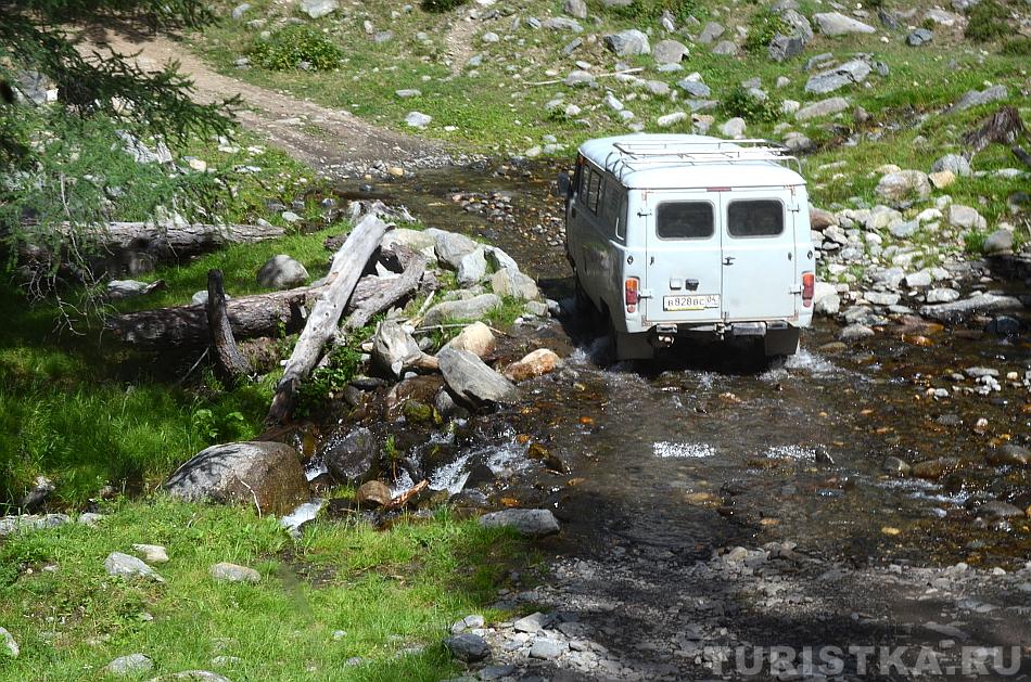Дорога к перевалу идет то через долину, в которой можно увидеть раскопанные курганы наваленные большими кругами камни, то пересекает речки, где броды с подводными валунами.