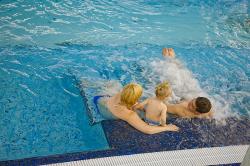 Рядом с большим бассейном находится детский бассейн, зона с лежаками.