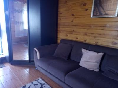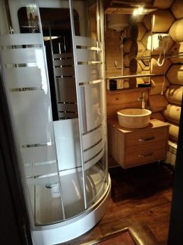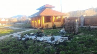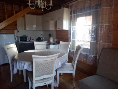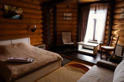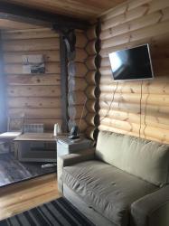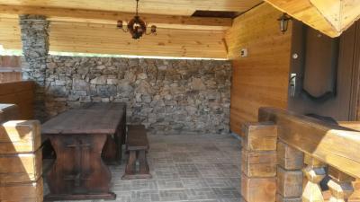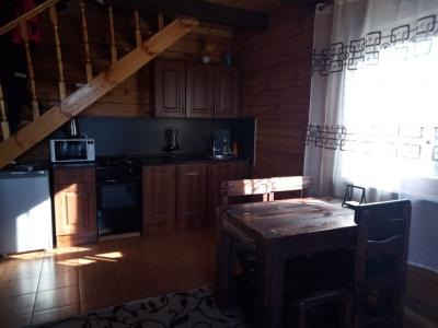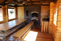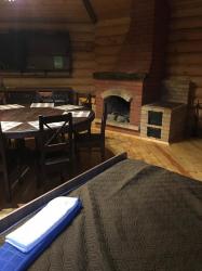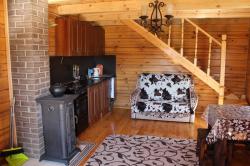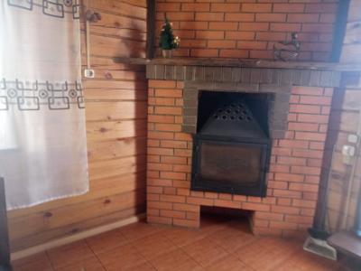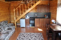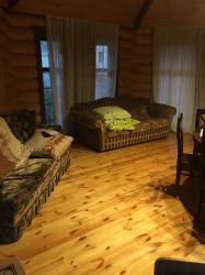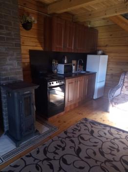 большим камином, с красивой кованой люстой и кухонным гарнитуром из чистого дерева. Вместимость 1-5 чел. 1 двухспальная кровать, 2 дивана, холодильник, плита, чайник, горячая и холодная вода, набор посуды, столовые приборы, утепленные туалет и душ на территории. Цена
