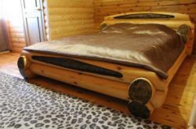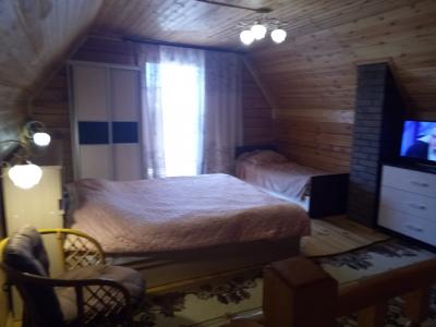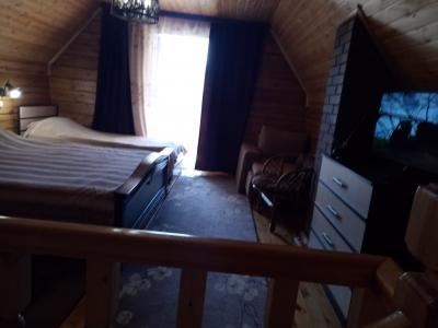 Спальные места: 1 этаж: диван-кровать, шкаф. 2 этаж: большая кровать из круглого бревна, столик журнаьный, комод, кресло, ТВ.