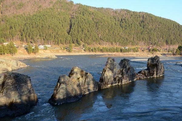 "Однажды на Алтай прилетело заморское чудище невиданное. Звалось оно дракон. Стал дракон сжигать поселения, уничтожать скот, ловить прекрасных девушек. Пришли люди к богатырю Сартакпаю помоги, избавь нас от дракона! Взял Сартакпай свой тугой лук, притаился за скалой и когда пролетал над Катунью огромный дракон, пустил Сартакпай меткую стрелу и поразил чудище в сердце. Рухнул дракон прямо в Катунь, только гребень его остался торчать посередине реки. От холодных струй Катуни окаменело тело дракона и видим мы сейчас на поверхности каменные острия его гребня.