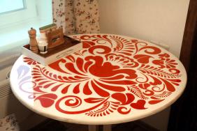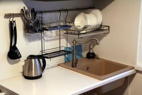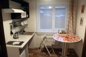 В кухне водопровод, стол и стулья, необходимая посуда.