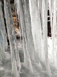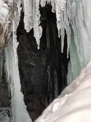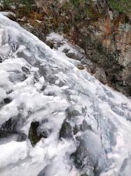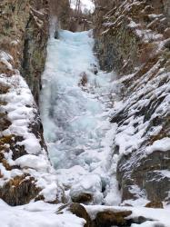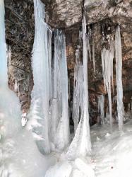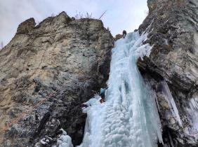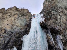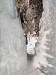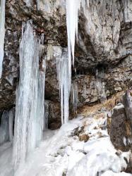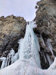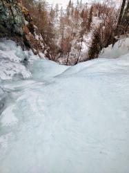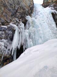 Выходят на длинную полку длиной около 50 м. Подходят к подножию вертикальной стены. Само подножие длиной около 5 метров и высотой 2-5 метра. Вертикальная стена высотой около 20 метров. Летом со стены срывается вода. Зимой стенка покрыта льдом.