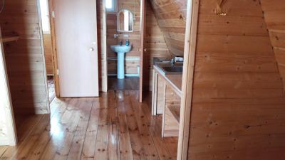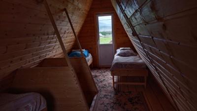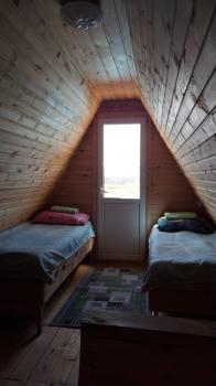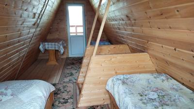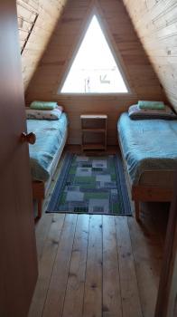 - Двухэтажный дом А-фрейм -- 8000 р. дом. Дом на 6 человек + 1 доп. место диван. В доме 4 односпальные кровати на втором этаже, на первом этаже двуспальная кровать, диван раскладной, телевизор, WiFi. Мини-кухня (холодильник, чайник, электроплита). Санузел в доме: душ, туалет, раковина.