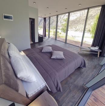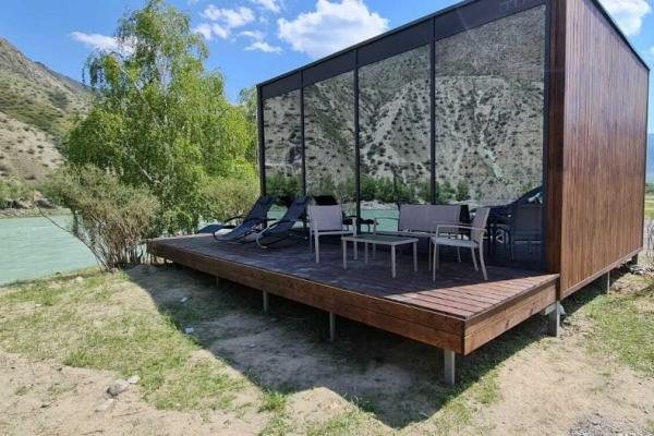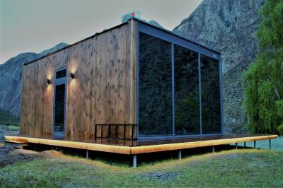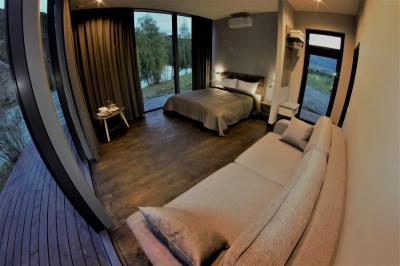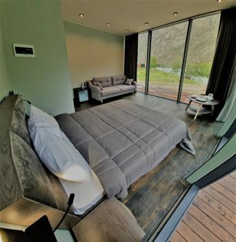 Большая двуспальная кровать, чайный набор, стол, стулья, кондиционер, душ, обогреваемый пол, фен, удобный диван, панорамное стена-окно с видом на Катунь и долину.
