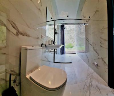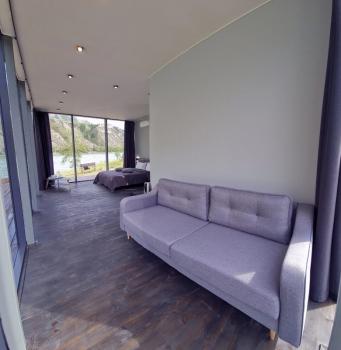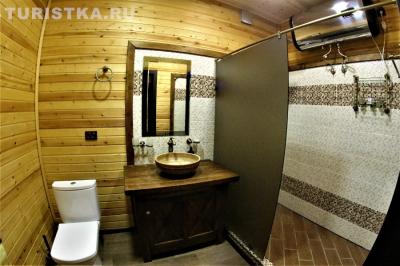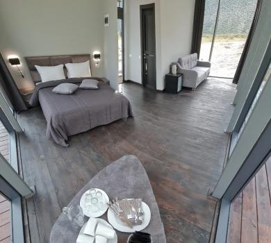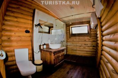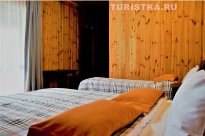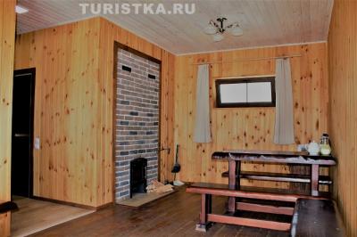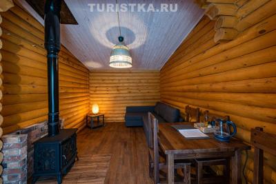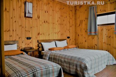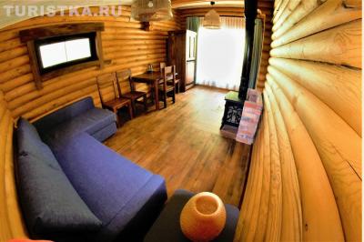 Двухкомнатный семейный коттедж из бруса с панорамными окнами и большой террасой. В одной комнате большая двуспальная кровать, в другой - камин и раcкладной двухместный диван. Один санузел. Комнаты не разделены дверьми. Дети до 5 лет без спального места бесплатно.