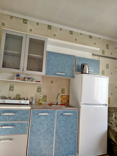 - Гостиная-кухня (холодильник, плита, чайник, СВЧ-печь, посуда)