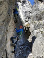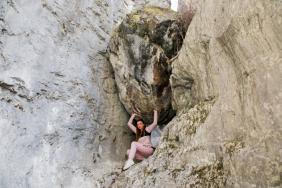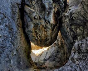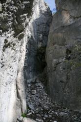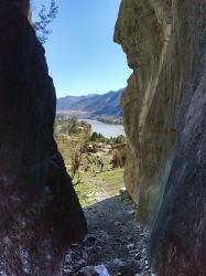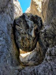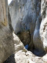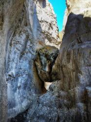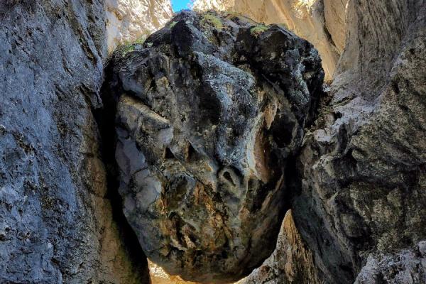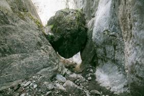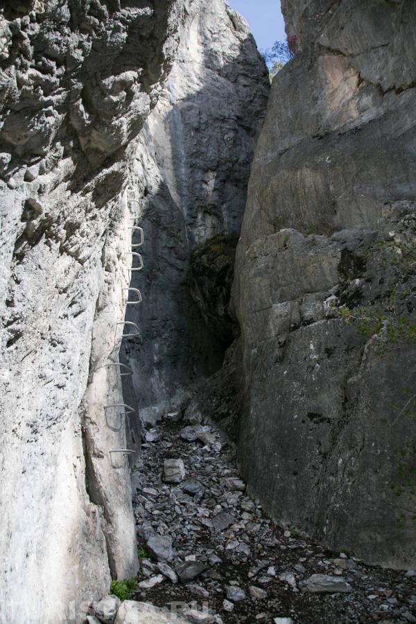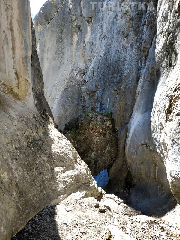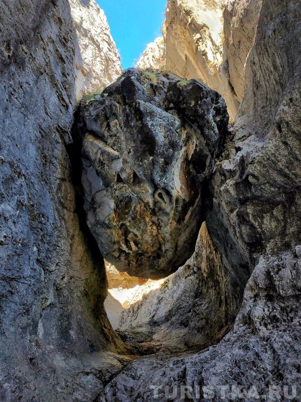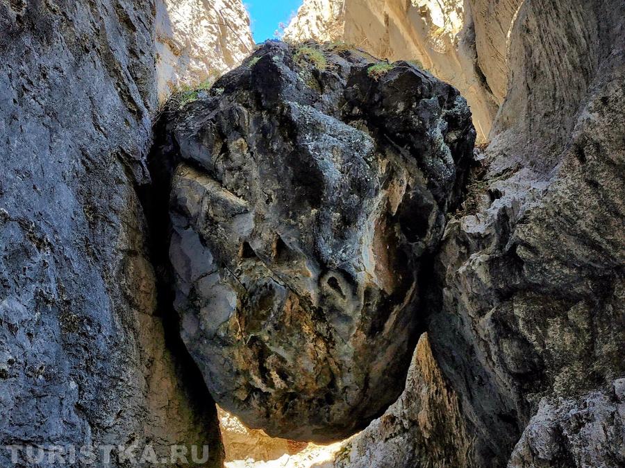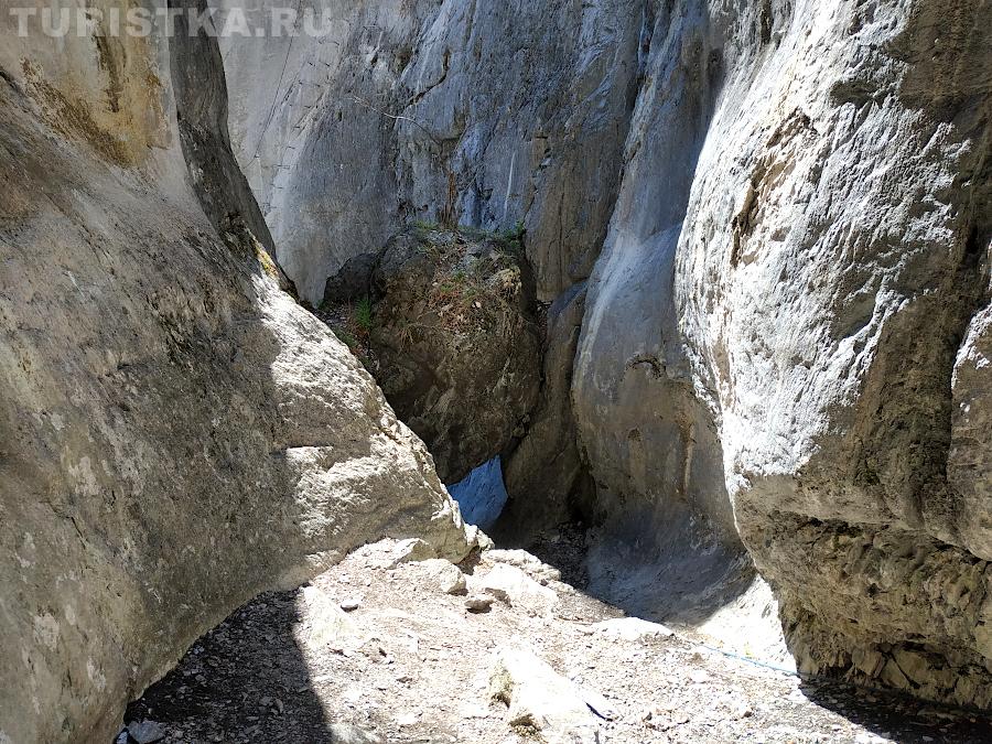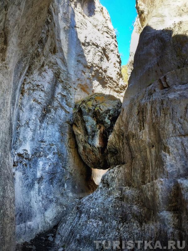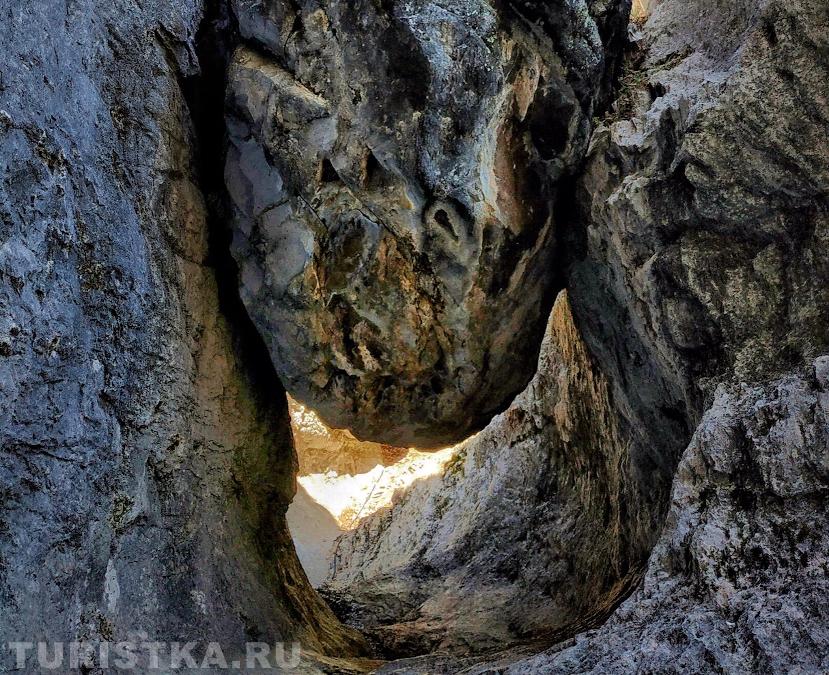 Он загораживает вход в узкий коридор скал, и чтобы туда пройти, придется пролезть под валуном. Для удобства под камнем протянуты капитальные перила, за которые можно держаться.