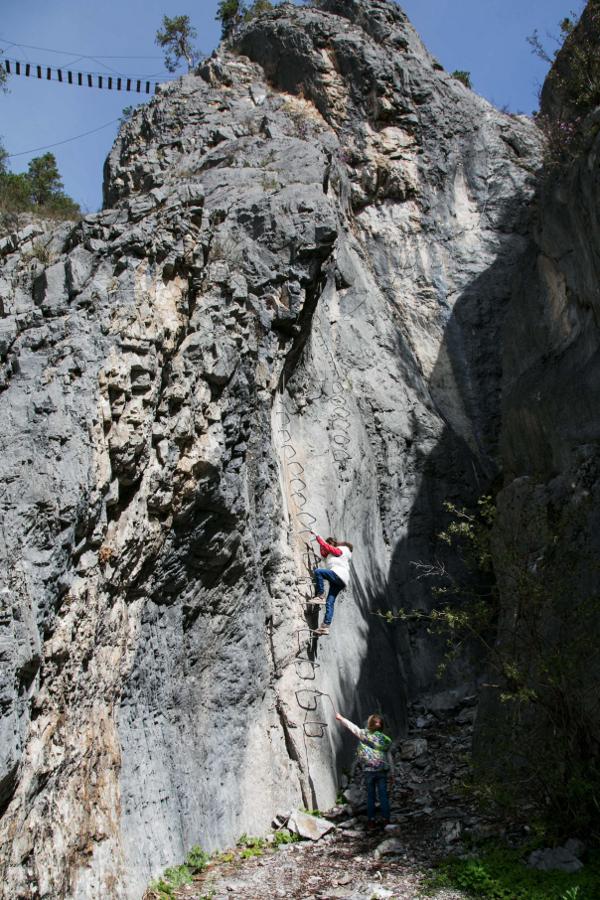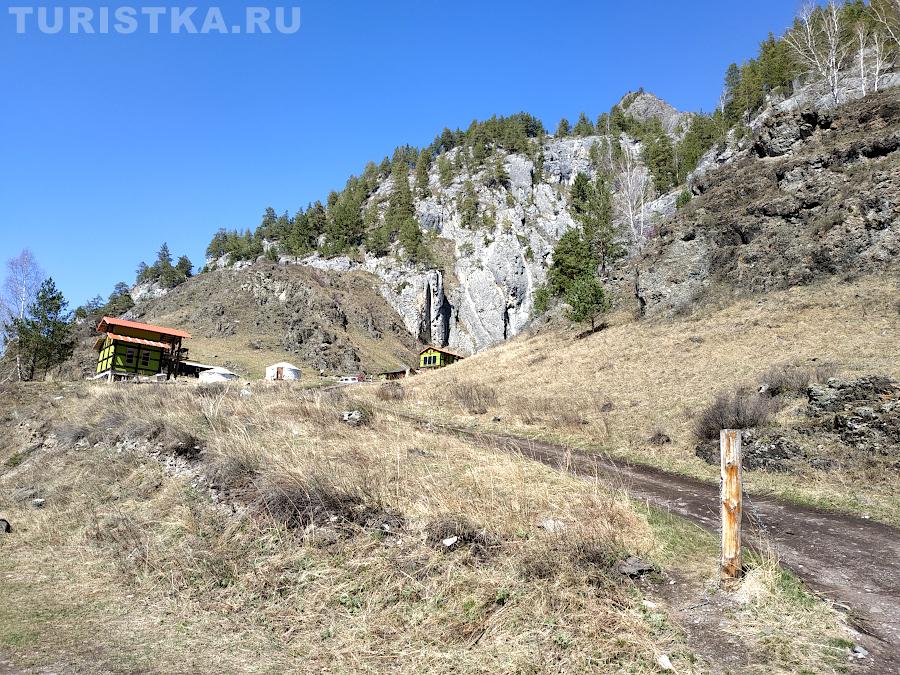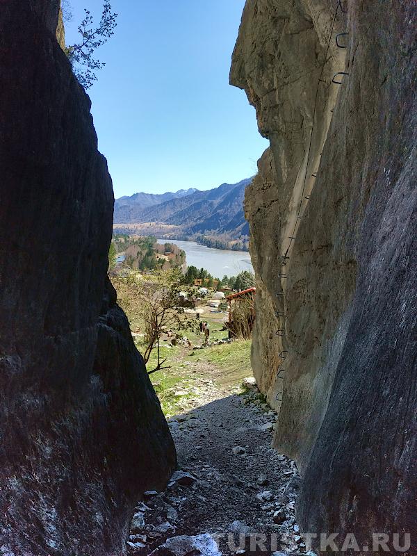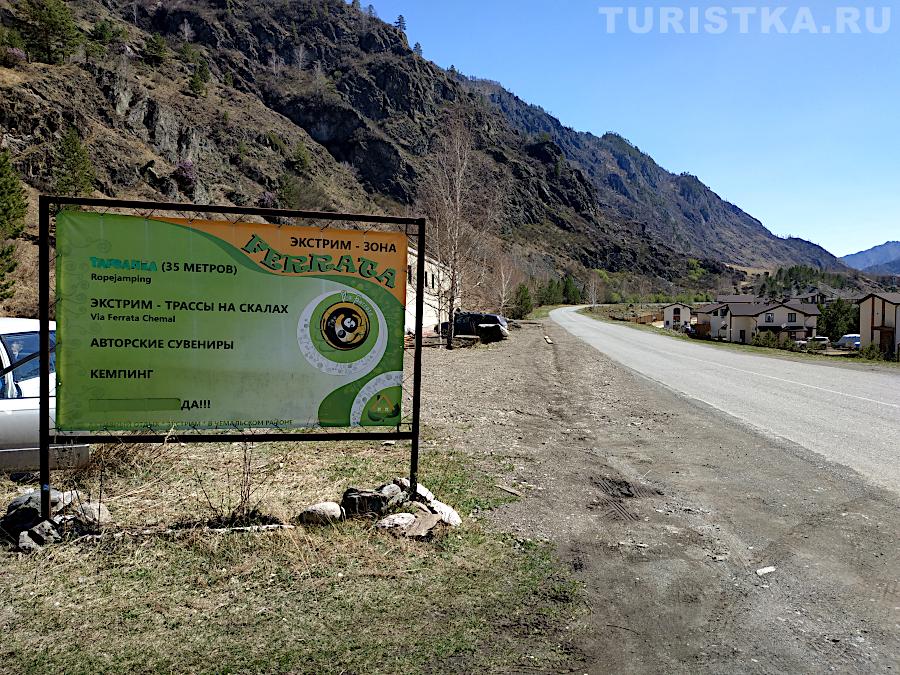 На 52 км Чемальского тракта по левую сторону будет вывеска экстрим-парк Виа Феррата. Поднимаетесь к Виа Феррате, в ущелье Арья-Ярык. Подниматься не долго - минут 5. Проход - 50 руб (сбор за очистку территории, пользование туалетом, лавочками).