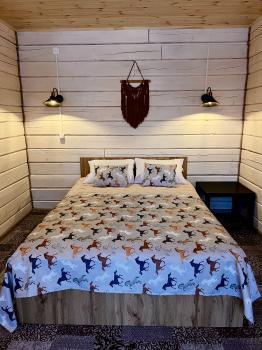 Двухкомнатный 4-хместный номер с кухней, гостиной и отдельной спальней. В домике отдельная спальня с двуспальной кроватью и кухня-гостиная. Оборудован раскладным диваном, обеденной зоной. Также есть холодильник, плита, чайник, посуда, ТВ. Санузел с душевой кабиной, раковиной и унитазом. На веранде стол и скамейки.