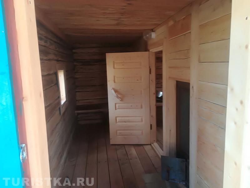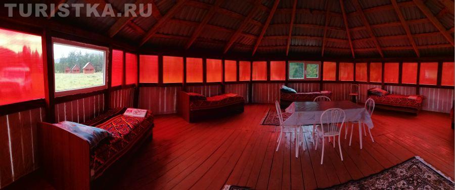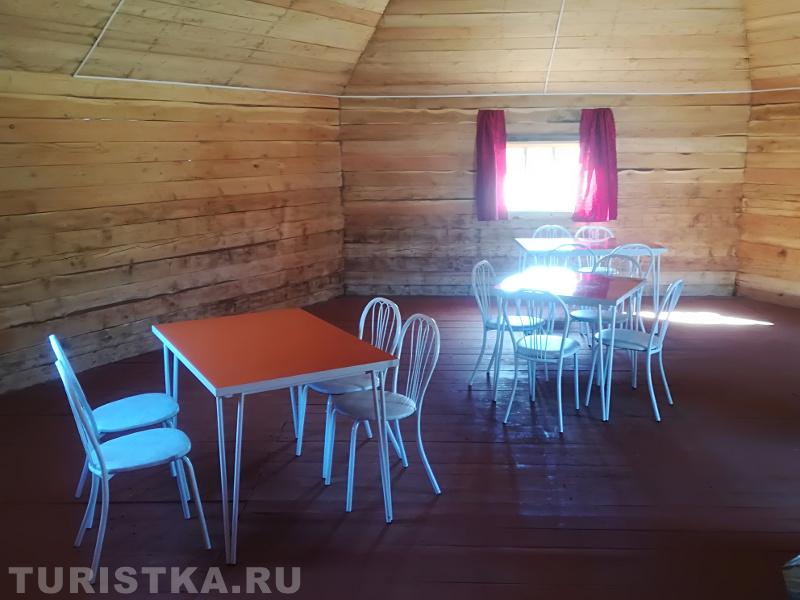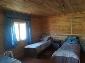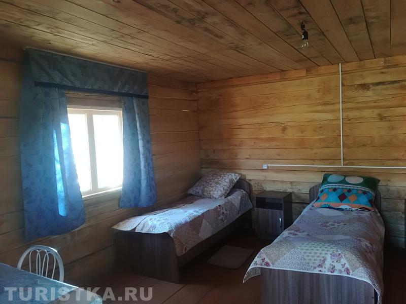8 односпальных кроватей, постельное белье, тумбочки для хранения личных вещей, электричество, отопление (печь), посуда, чайник, стол обеденный, стулья.
