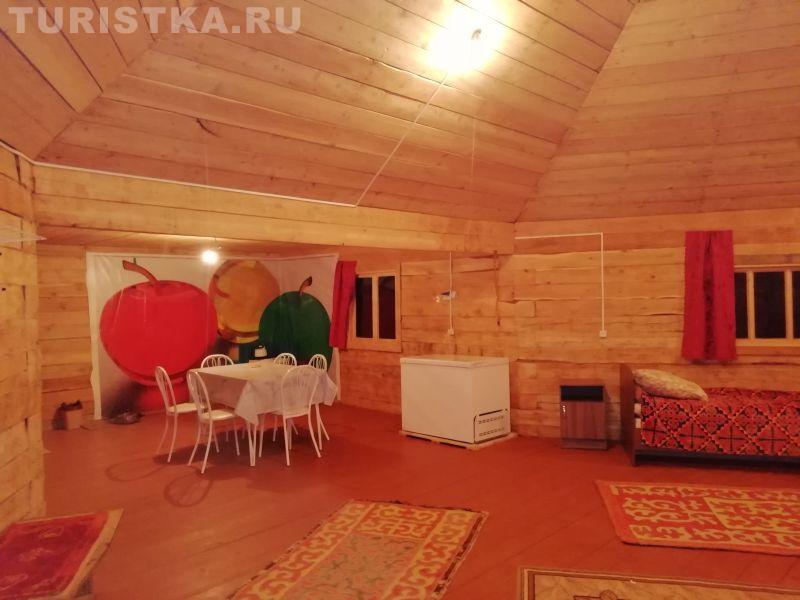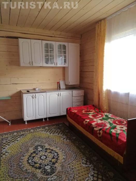 10 односпальных кроватей, электричество, печь, зона кухни (газ. плита, стол, стулья, посуда).