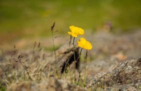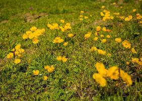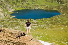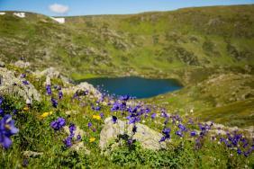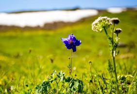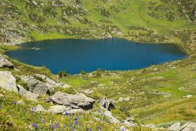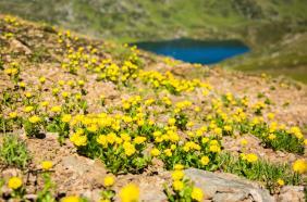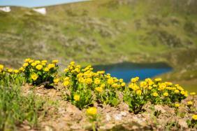 Со стоянки открывается вид на синюю гладь Башталинского озера. Озеро находится внизу: спускаться недолго - метров 700, а вот обратный подъем на ту же высоту будет уже тяжелее. Зато дорогу скрасят снежники и заливные луга из желто-синих цветов. Самые смелые в озере купаются. А желающие запечатлеть живописные закаты и рассветы остаются у озера с палаткой.