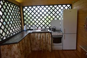 Беседка-кухня: холодильник; электро-газовая плита с духовым шкафом; микроволновая печь; чайник; мультиварка; раковина с горячей и холодной водой; посуда; столовые приборы; четыре стола со скамейками; мангал с шампурами.