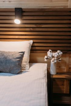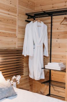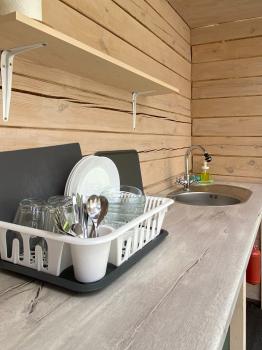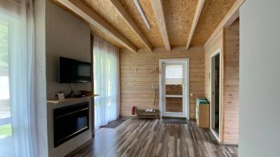 Дом Комфорт: 2 осн. места +2 доп.места. Двуспальная кровать, диван, сан.узел с душем со всеми гигиеническими принадлежностями, пол с подогревом, места для хранения вещей, телевизор, камин, отдельно стоящая индивидуальная кухня-беседка с холодильником, плитой, посудой, обеденной и мангальной зоной.