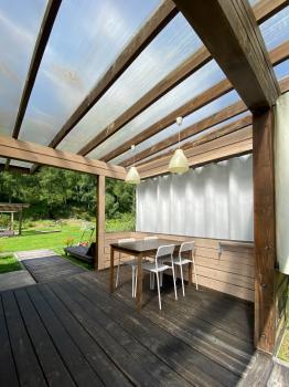 Дом Дуплекс: 2 осн. места +2 доп.места. Дом на двух хозяев, при этом у каждого дома своя беседка и свой вход в дом. Двуспальная кровать, диван, сан.узел с душем со всеми гигиеническими принадлежностями, пол с подогревом, места для хранения вещей, телевизор, камин, отдельно стоящая индивидуальная кухня-беседка с холодильником, плитой, посудой, обеденной и мангальной зоной.сан.узел со всеми гигиеническими принадлежностями.