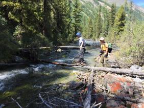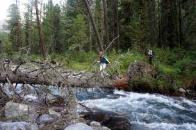 От нижнего Шавлинского озера вы спускаетесь почти до слияния правой и левой Шавлы. Выше слияния правая Шавла растеклась на несколько рукавов. Ищете подходящую переправу по бревнам. Придется перейти несколько проток.