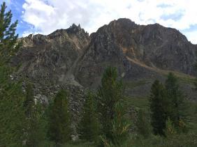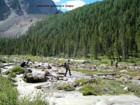 После переправы на левый берег, надо найти тропинку в лесу, которая поведет вас налево и в гору. Вас ждет крутой подъем в висячую долину. Перепад высот от реки до висячей долины примерно 200 метров. Минут 30 быстрой ходьбы или 50-60 минут медленного хода и вы доберетесь до озера!