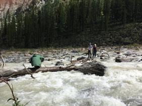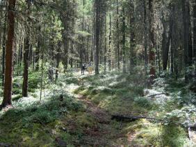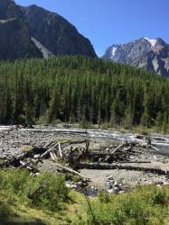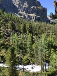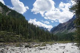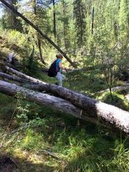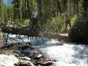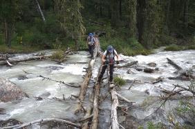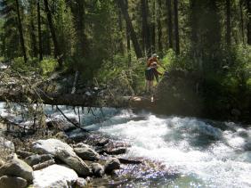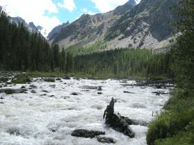 Затем будет лес между двумя речками. Выходите к Левой Шавле и идете вверх по течению прямо по берегу. Доходите до места, где висячая долина (на противоположном берегу реки) почти напротив вас (немного левее) и ищите возможность перейти на левый берег реки. Сначала, если низкая вода, вы будете перешагивать и перепрыгивать разливы ручейков, затем около левого берега ищите бревна, по которым вам удобно будет перейти. Бревен много, русло реки завалено упавшими деревьями.
