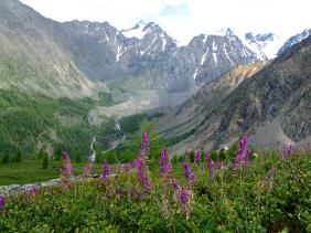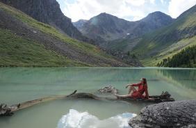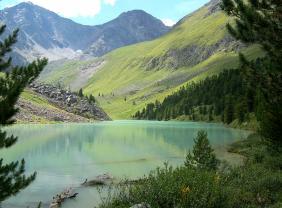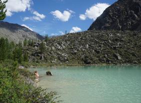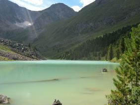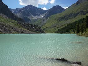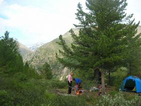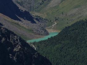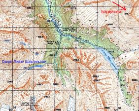 Если идти к началу озера, обходя его справа (левый берег орографически), то тропинки идут среди карликовой березки (обязательно наденьте длинные штаны). В низовьях озера долина почти горизонтальная, между карликовой березки разбросано много больших валунов, растут кедры. Здесь есть хорошее уютное место для небольшой стоянки.