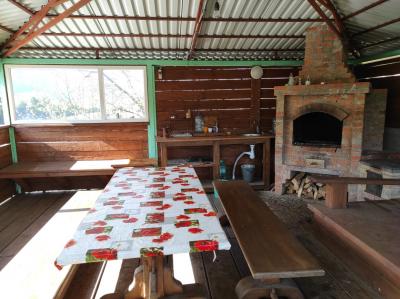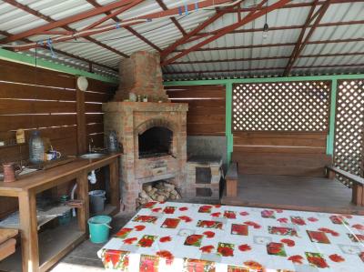 На территории теплый дом, банька, беседка с печью для барбекю на берегу реки (40 кв. м).