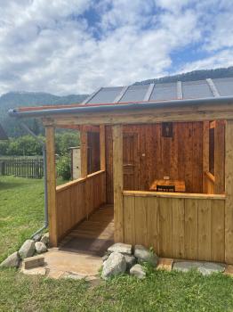 Одна жилая комната на 4-5 человек и открытая веранда с обеденной зоной. В доме: 3 кровати, диван, тумбочки; стол, микроволновка, чайник, набор посуды. Печь длительного горения, ТЁПЛЫЙ ПОЛ. Веранда: стол, лавки; газовая плита; проточная холодная и горячая вода.